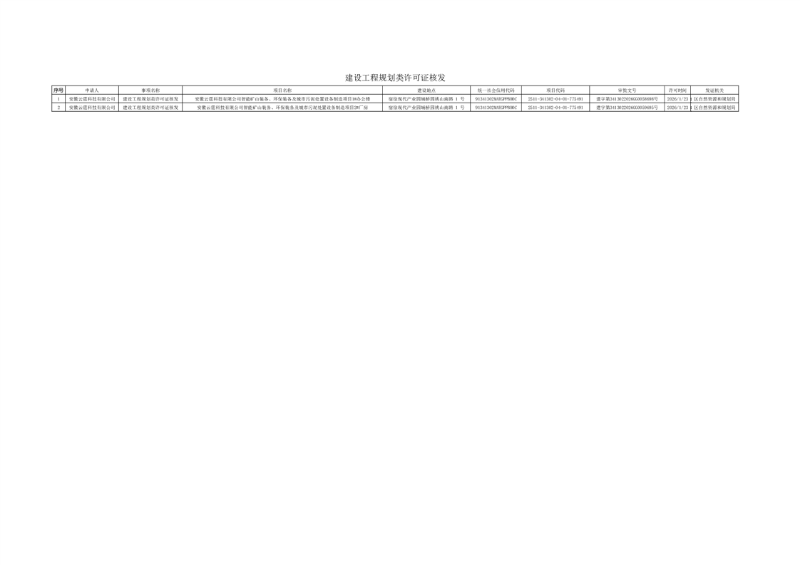 安徽云霆科技有限公司智能矿山装备、环保装备及城市污泥处置设备制造项目建设工程规划类许可证核发