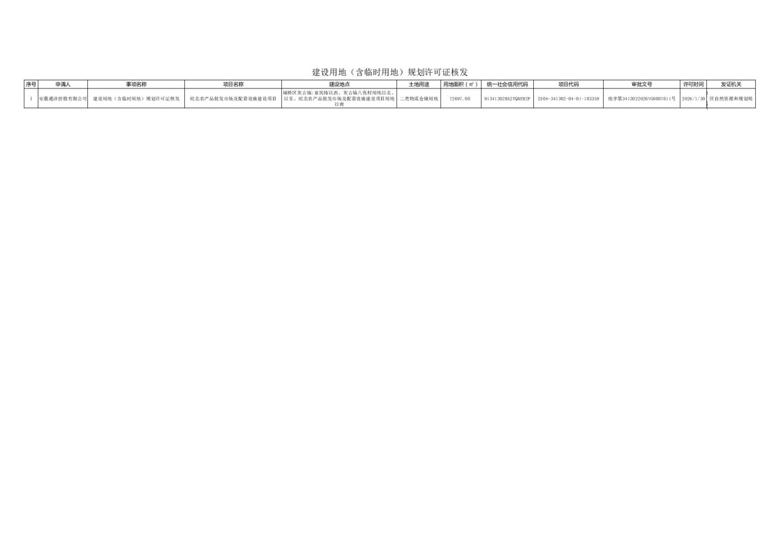 安徽通济控股有限公司皖北农产品批发市场及配套设施建设项目建设用地(含临时用地)规划许可证核发