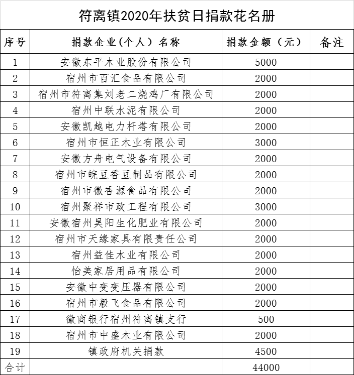【扶贫捐赠款物汇总及使用安排】符离镇2020年“全国扶贫日”爱心募捐活动汇总表