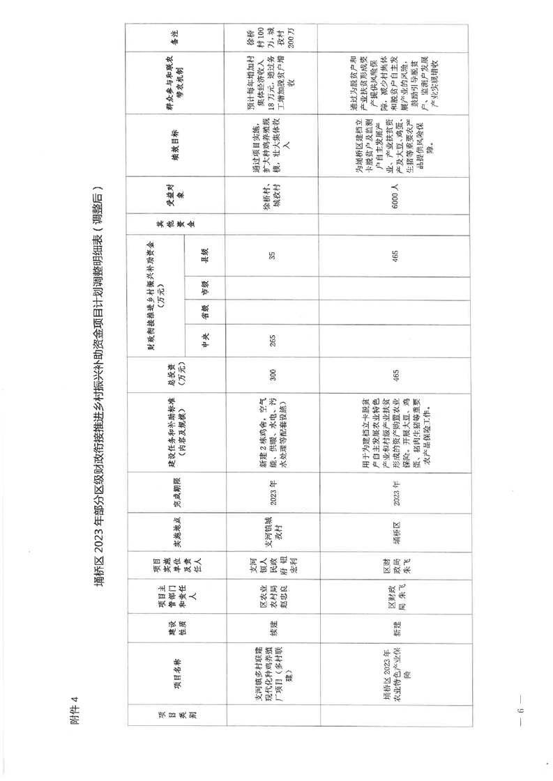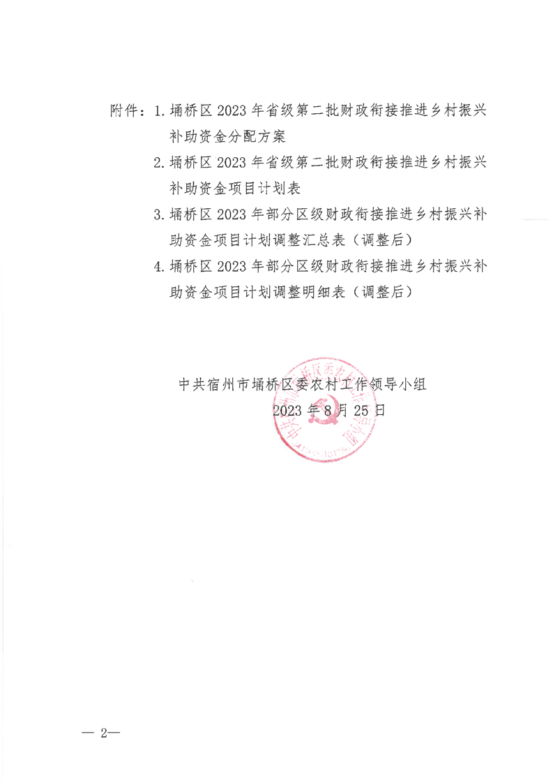 关于埇桥区2023年省级第二批财政衔接推进乡村振兴补助资金分配方案及项目计划和部分区级衔接资金项目计划调整的批复