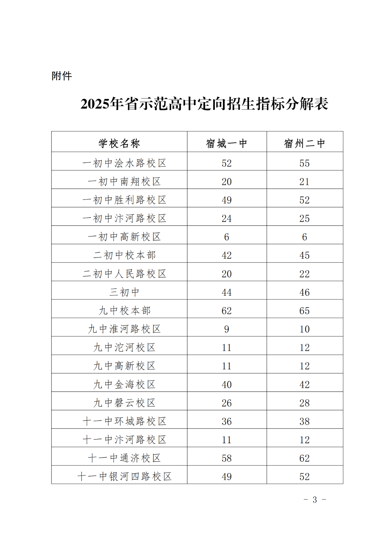 为深化普通高中招生制度改革,切实规范招生入学行为,保持省示范高中指标分配政策,根据《宿州市教体局关于印发2025年全市普通中小学招生入学工作实施方案》(宿教体基〔2025〕10号)和《关于下达2025年高中阶段教育招生计划的通知》(宿教体计〔2025〕11号)文件精神,以及自主招生计划纳入学校总计划但不列入定向指标分配的要求,现依据各校实际在籍且就读满三年并报名参加初中学业水平考试的毕业年级学生数,把省示范高中招生计划80%的比例切块分解至各初中学校,依据志愿从高分到低分按照排名位次依次录取。