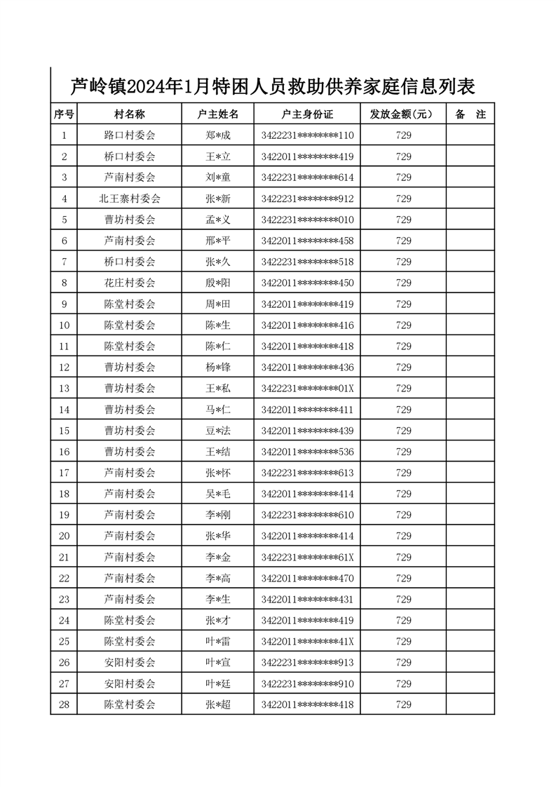 芦岭镇2024年1月特困人员救助供养家庭情况