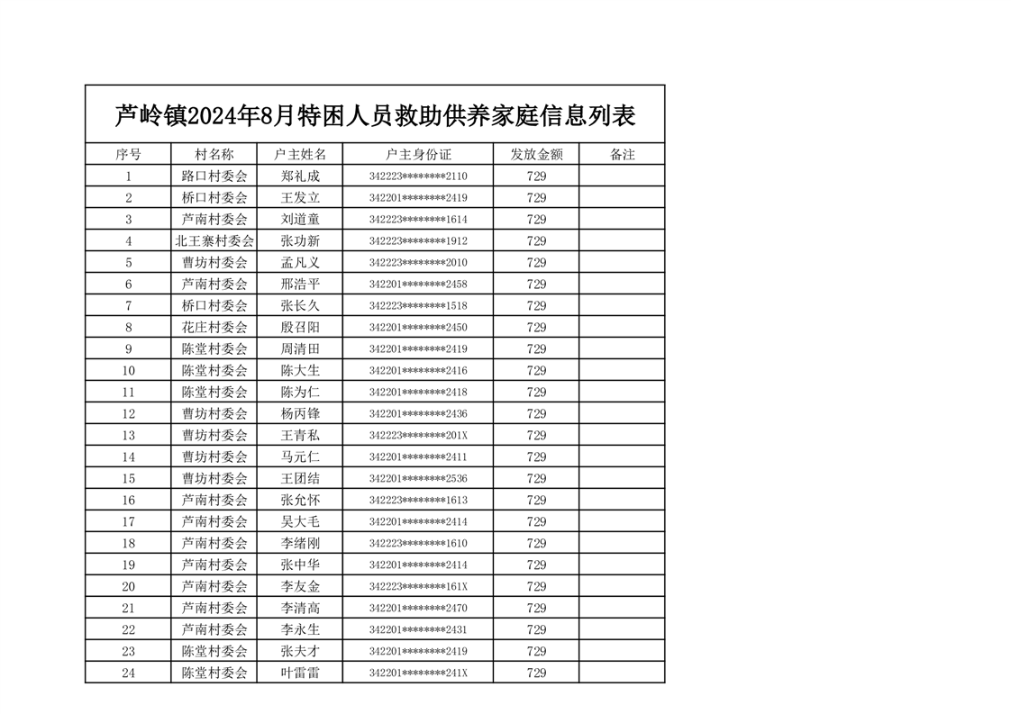 芦岭镇2024年8月特困人员救助供养家庭信息列表