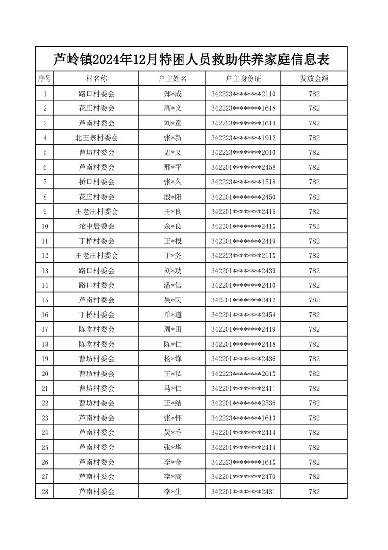 芦岭镇2025年1月特困人员救助供养家庭信息列表