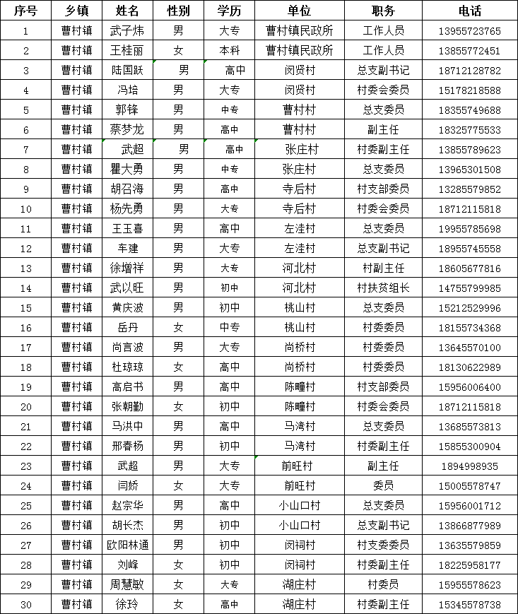曹村镇灾害信息员及联系电话
