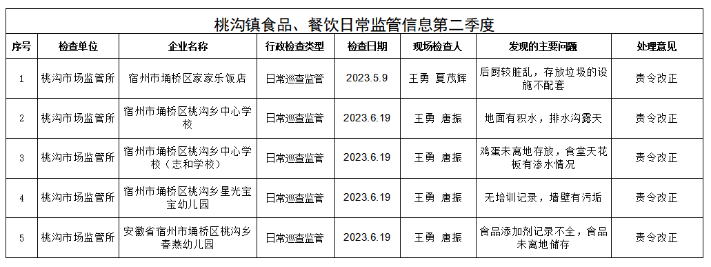 桃沟市场监督管理所2023年第二季度食品药品、产品质量安全工作抽查结果、查处情况、检查中发现的问题及处理情况