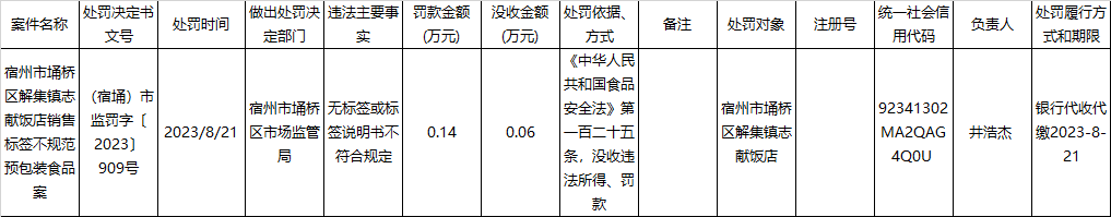 2023年第三季度食品药品生产经营监管行政处罚公示表