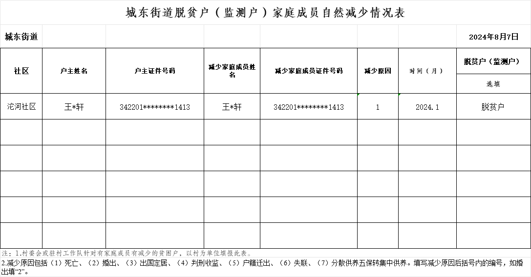 城东街道关于2024年7月脱贫户、监测户人口动态调整自然减少表