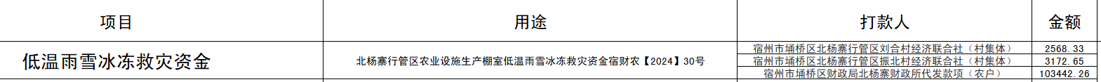 截止目前,2024年一季度北杨寨行管区因寒潮冻雨自然灾害,相关受灾信息统计上报后,上级批复相关灾害资金如下: